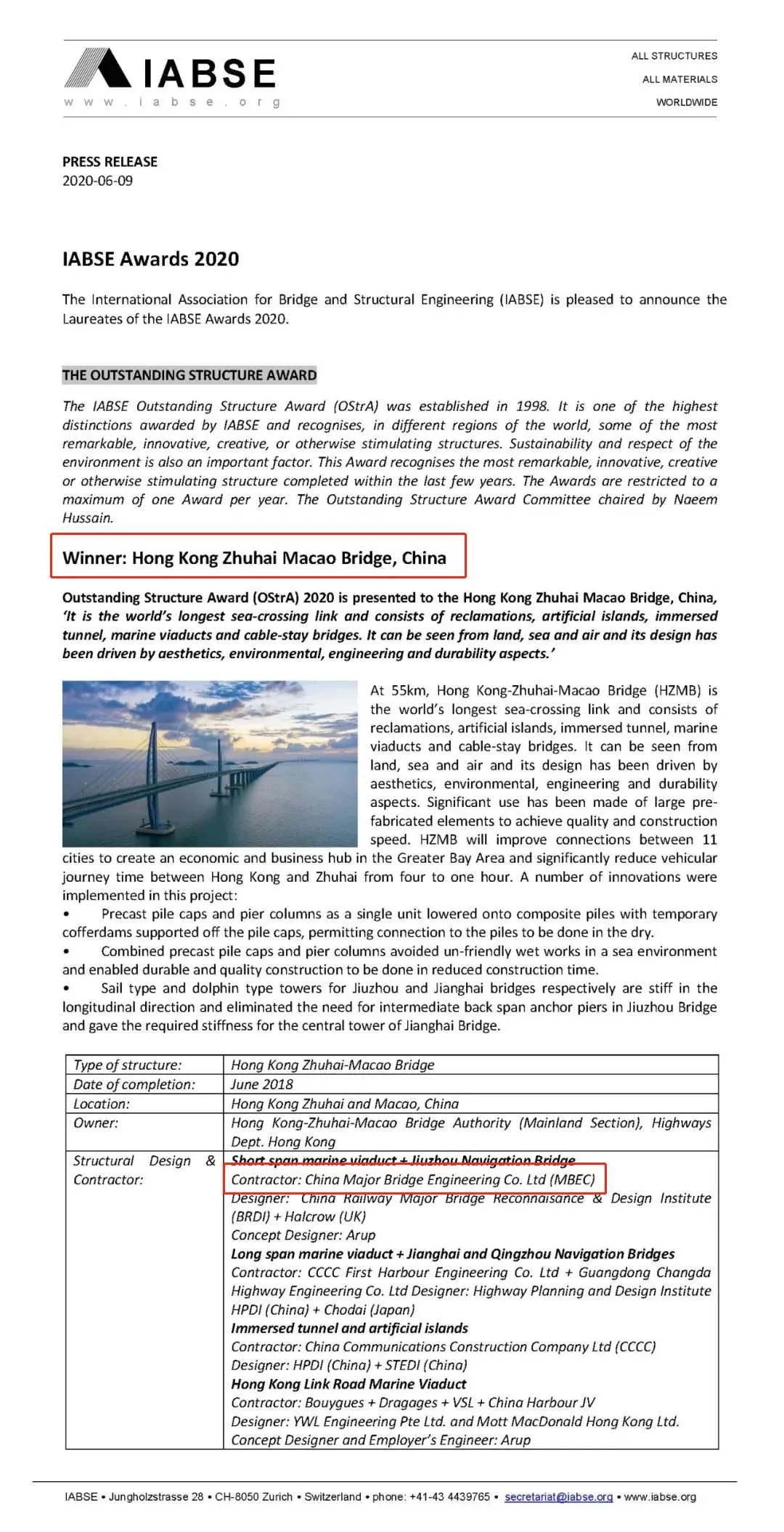國際橋梁及結構工程協(xié)會(IABSE)杰出結構大獎設立于1998年,主要在世界不同地區(qū)表彰一些最杰出、最具創(chuàng)新性、最具創(chuàng)造性或其他最具啟發(fā)性的結構,同時也考慮結構的可持續(xù)性和尊重環(huán)境,該獎被廣泛承認為IABSE頒布的最高榮譽獎之一,影響力大,含金量高。