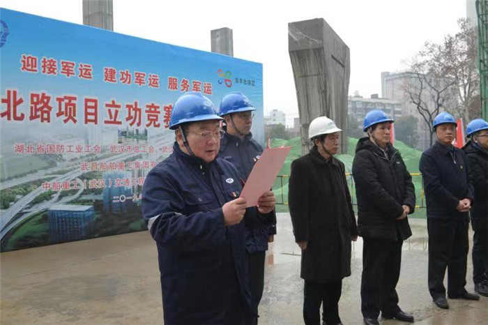 2月20日上午,在寶豐北路項目建設工地,湖北省國防工會、武漢市總工會、武漢市國防科研工會聯合武船集團舉行2019年第一場“迎接軍運會 建功軍運會 服務軍運會”立功競賽活動啟動儀式。