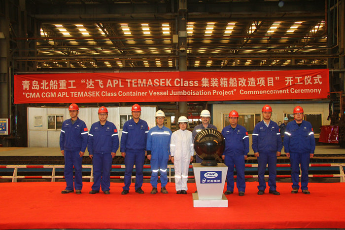 4月2日下午15點58分,武船集團北船重工“達飛公司系列集裝箱船升級改造項目”開工儀式在北船重工造船聯合廠房順利舉行。法國達飛輪船公司改裝項目現場經理MR.JAN IVERSEN,DNV-GL船級社高級驗船師包青波,北船重工副總經理于寶月、劉玉東及總經理助理丁福增,北船重工造船相關部門和修船分廠的領導出席了儀式。