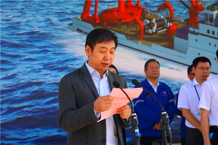 國家自然資源部海洋預(yù)警監(jiān)測司觀測處處長陳陟、國家海洋局東海分局副局長唐文勝、國家海洋局南海分局副局長謝健、國家海洋局北海分局副局長孫利佳、中國船級社武漢分社副總經(jīng)理余德斌、上海佳船工程監(jiān)理發(fā)展有限公司副總經(jīng)理王道順、中船重工第701研究所所長助理楊鐘、武船集團副總經(jīng)理王渭齡為下水剪彩。唐文勝行擲瓶禮。