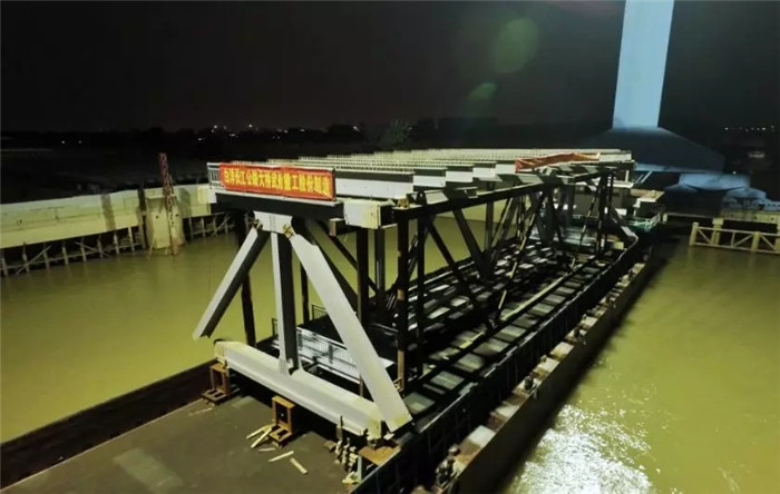▲白洋長江大橋主橋首個鋼桁梁節段裝船發運