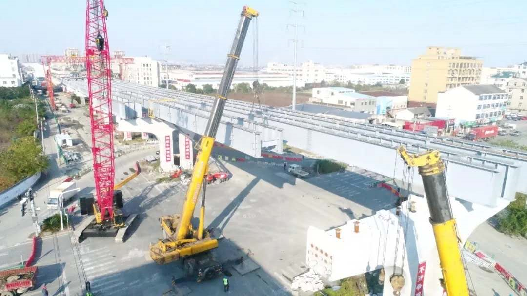 ▲最后一片鋼板梁正在吊裝