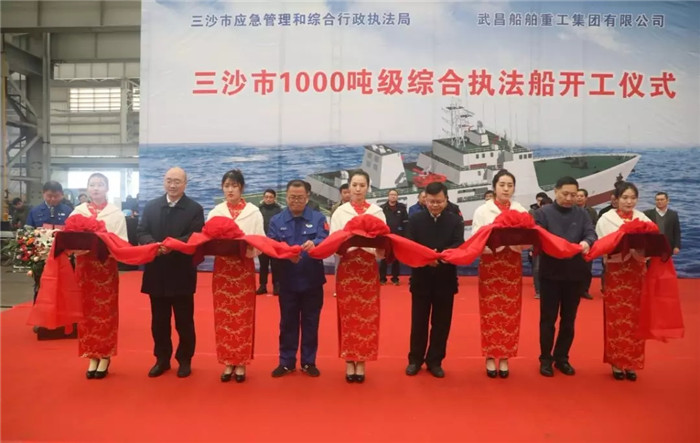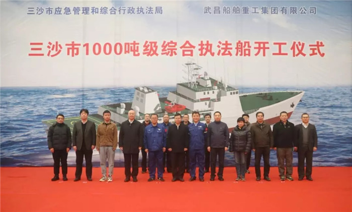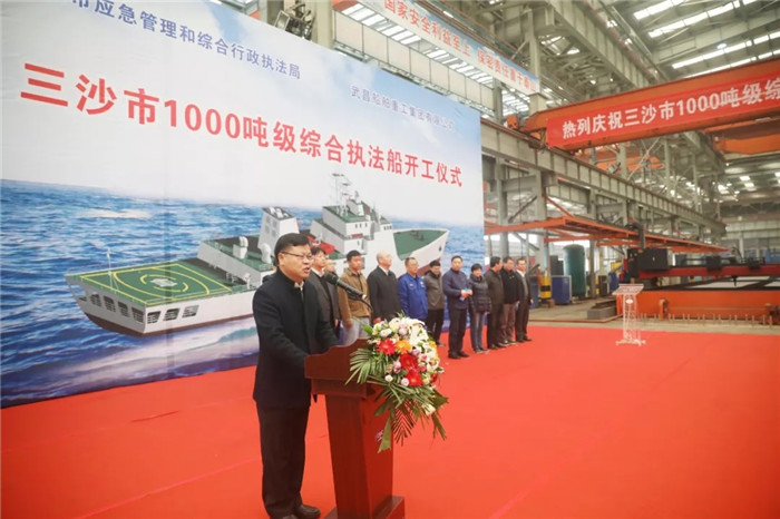 2019年12月2日上午10點(diǎn)08分,三沙市1000噸級(jí)綜合執(zhí)法船開(kāi)工儀式在武船集團(tuán)雙柳基地順利舉行。
